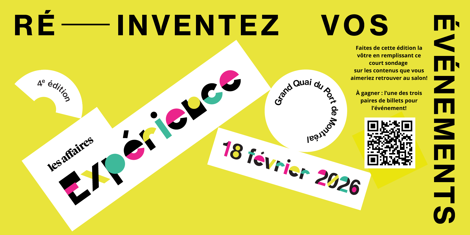 Le plus grand salon d'événementiel d'affaires du Québec est de retour! Préparez-vous à vivre Expérience, une journée exceptionnelle qui redéfinira votre perspective sur l'organisation d'événements. Immergez-vous dans un monde d'expériences enrichissantes et de contenus inspirants.